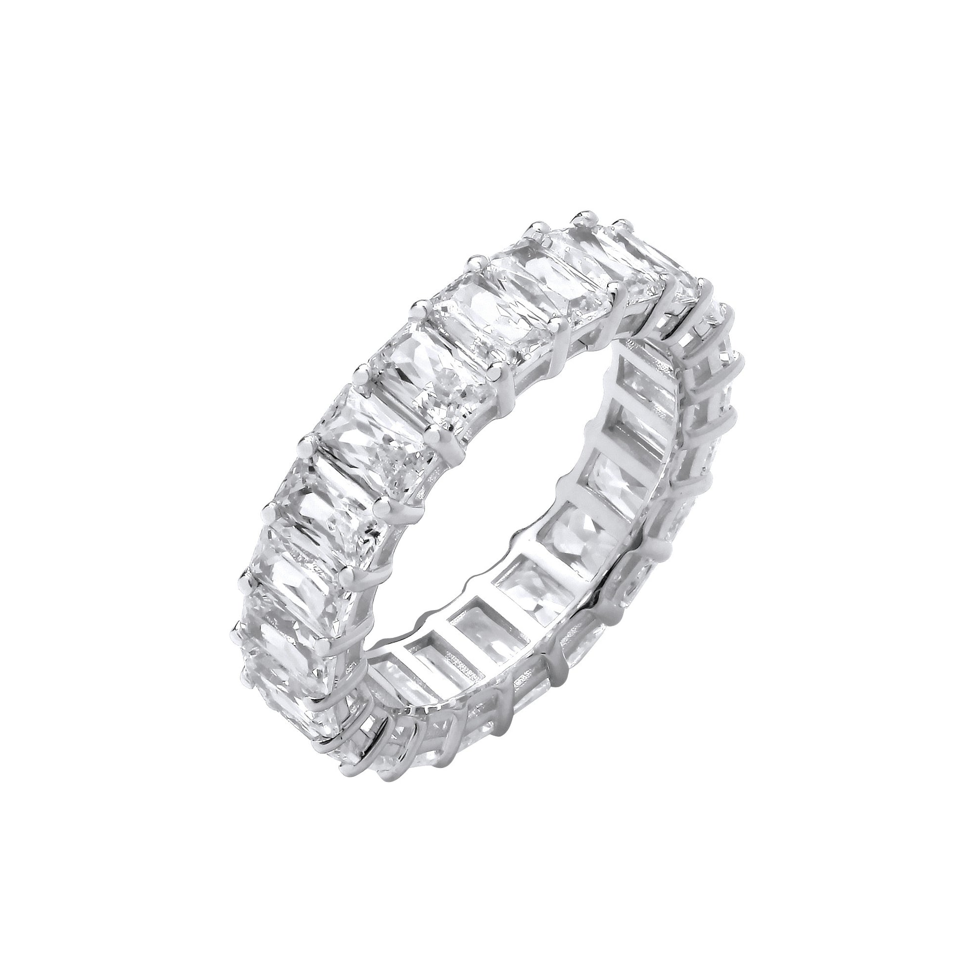 - 6.70 total carats of radiant-cut lab-grown diamonds arranged in a seamless eternity band for continuous sparkle.